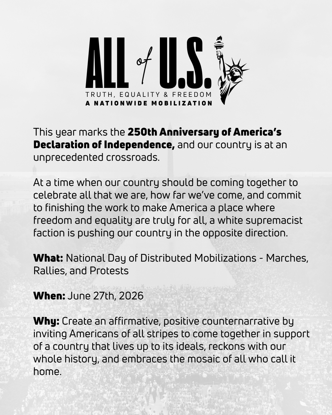 If you want America to repair its history rather than erase it, we need your voice. Join a mobilization near you to wield our power in the streets and demand a future of freedom.